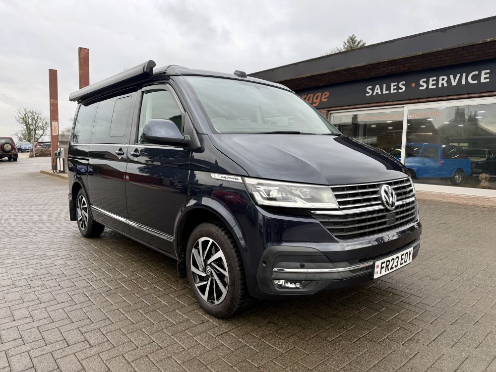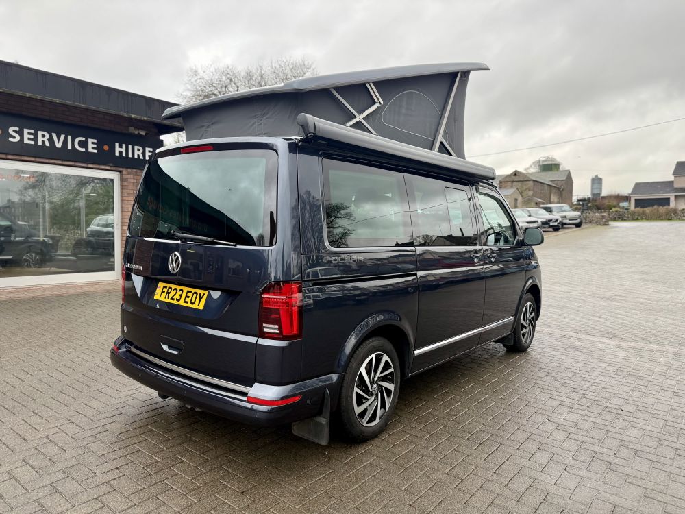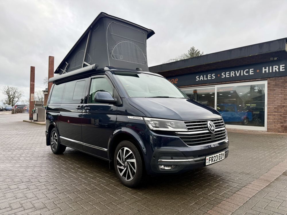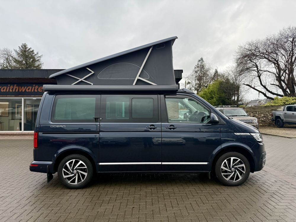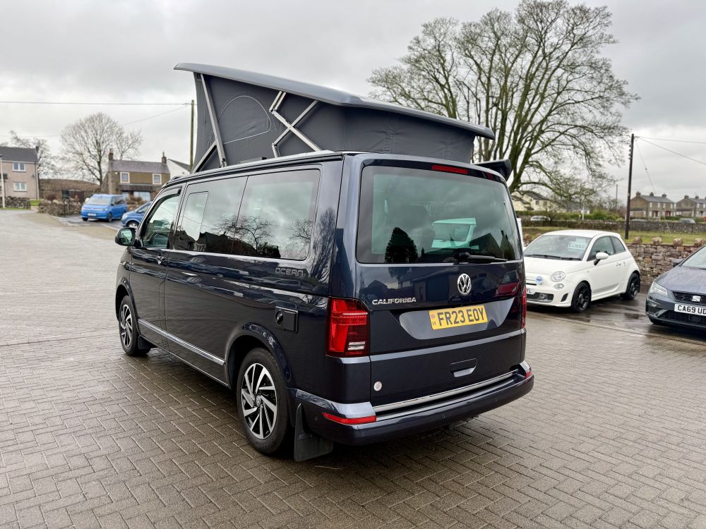 This 2023 VW California Ocean is a higher powered 204bhp model that looks great in Starlight Blue and comes very highly specified with optional extras including detachable tow bar, art velours interior, comfort mattress with bed extension, Discover Pro infotainment system & much more. Equipped with all usual California Ocean refinements including electric pop up roof, 2x two berth beds, night heater, twin leisure batteries, kitchen unit, touch screen control panel & more. Only 12,000 miles and one owner from new with full VW service history. Supplied freshly serviced ready for adventure! Finance options available and part exchange welcome - get in touch for more details.