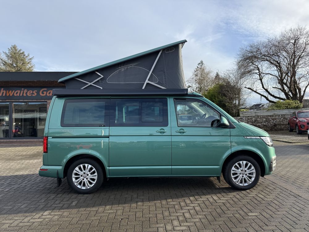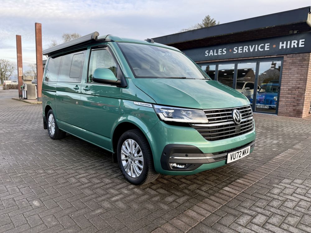 This 2022 VW California Ocean looks stunning in Bayleaf Green and comes very highly specified with optional extras including detachable tow bar, heated windscreen, outdoor shower, comfort mattress & more. Equipped with all usual California Ocean refinements including electric pop up roof, 2x two berth beds, night heater, twin leisure batteries, kitchen unit, touch screen control panel & more. Only 14,000 miles and one owner from new with full VW service history. Supplied freshly serviced ready for adventure! Finance options available and part exchange welcome - get in touch for more details.